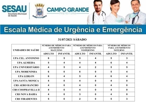A escala médica de urgência e emergência da rede pública de saúde de Campo Grande, funciona na manhã desta sábado (31), com 48 médicos, clínico geral e 18 pediatras atendendo nas Unidades de Pronto Atendimento (UPAs) e Centro Regional de Saúde (CRS).