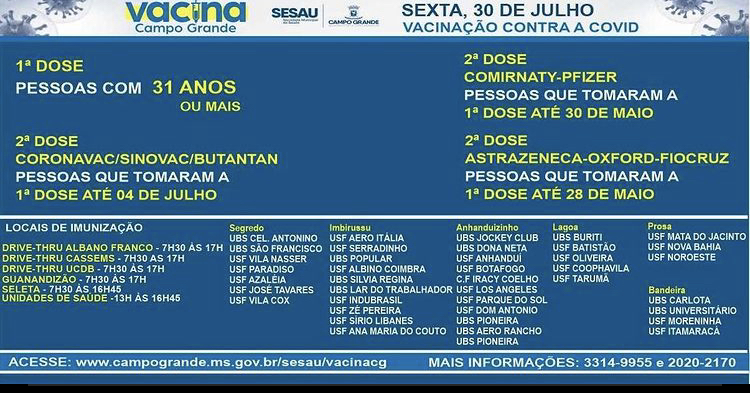 Imunização contra a Covid-19 em Campo Grande, nesta sexta-feira (30) será para pessoas com 31 anos ou mais. Além disso, aplicação da segunda dose continua.