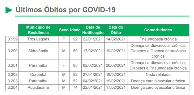 O número de óbitos diminuiu e pela primeira vez a capital não registrou nenhuma morte de paciente nas últimas 24h. As cidades que tiveram perdas foram Paranaíba (2), Três Lagoas, Sidrolândia, Corumbá, Aquidauana, como mostra o quadro abaixo, produzido pela Secretaria de Estado de Saúde gerados às 19hs do dia 20 e publicado às 10:30hs de hoje.
