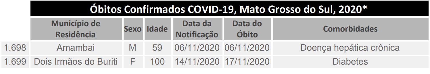 Conforme o boletim epidemiológico, foram registrados dois óbitos, um em Amambaí e outro em Dois irmão do Buriti. Uma das mortes foi registrada no dia 6 a outro no dia 17 de novembro.