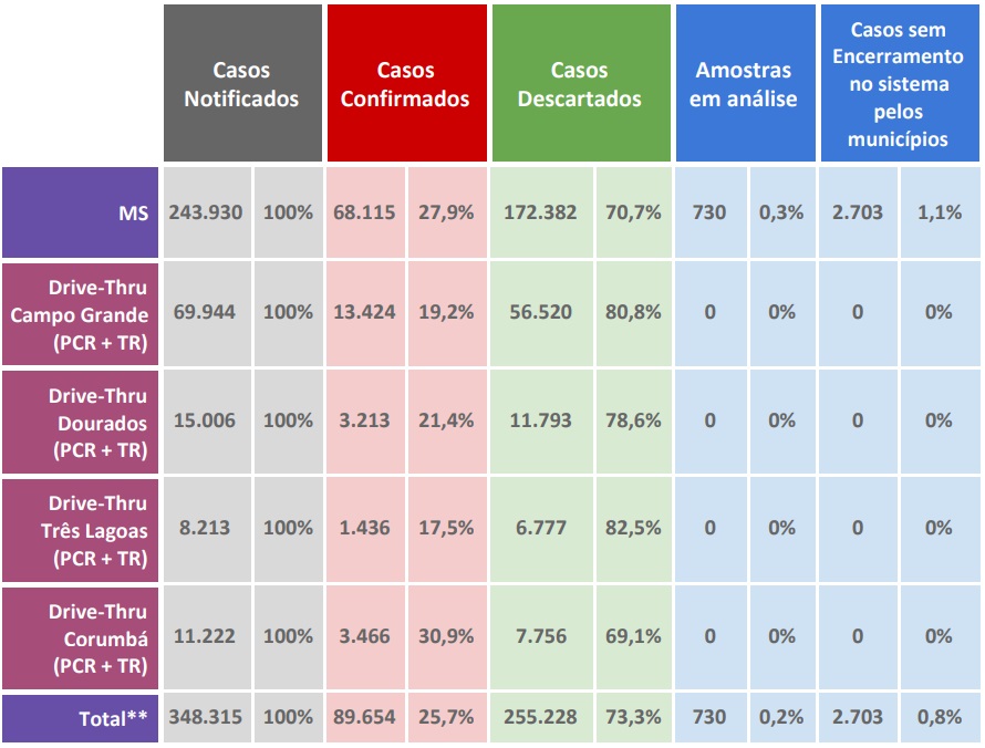 Conforme o boletim, MS já soma 348.315 casos notificados dos quais 255.228foram descartados. Há 730 amostras em análise no Laboratório Central de Mato Grosso do Sul (Lacen-MS) e 2.703 casos ainda aguardam encerramento pelos municípios.