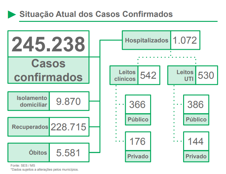 De acordo com a SES, Mato Grosso do Sul registrou mais 1.038 casos e 39 mortes em decorrência do coronavírus. Estado já registra 245.238 casos confirmados e 5.581 óbitos pela doença. 9.870 seguem em isolamento domiciliar, enquanto 1.072 estão hospitalizados, sendo 542 em leitos clínicos e 530 em leitos de UTI.