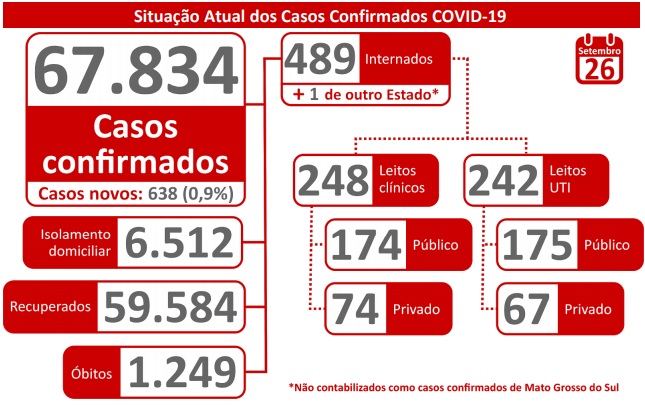 De acordo com a SES, dos 638 novos casos, 282 são de moradores de Campo Grande, em Dourados com teve 72, Três Lagoas com 38, Cassilândia com mais 20 casos e Miranda com 18. As cinco cidades que teve mais casos desde o inicío da pandemia, a Capital já contabiliza um total de 29.830 registros da doença, Dourados tem 7.126, Corumbá já registrou 3.986 casos, Três Lagoas com 2026 óbitos e Sidrolândia com 2.002.