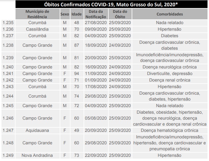 Em 24h, Campo Grande teve oito óbitos, Corumbá com quatro mortes pelo novo coronavírus e outros 3 municípios teve uma morte pela doença, são eles, Aquidauana, Cassilândia e Nova Andradina.