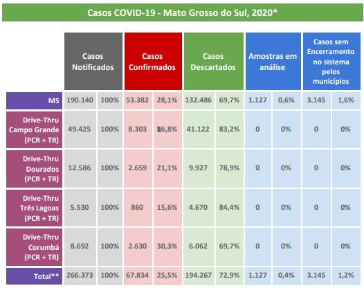 Conforme o boletim, MS já soma 266.373 casos notificados, dos quais 194.267 foram descartados. Há 1.127 amostras em análise no Laboratório Central de Mato Grosso do Sul (Lacen-MS) e 3.145 casos ainda aguardam encerramento pelos municípios.