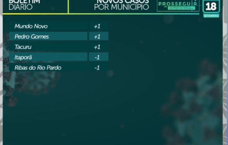 Ao todo, 51 municípios registraram casos novos, sendo 514 em Campo Grande, 123 em Corumbá, 51 em Dourados e 32 em Três Lagoas. As cidades citadas tiveram os maiores números de infecções confirmadas nas últimas 24h. (veja os números completos no anexo ao final do texto).