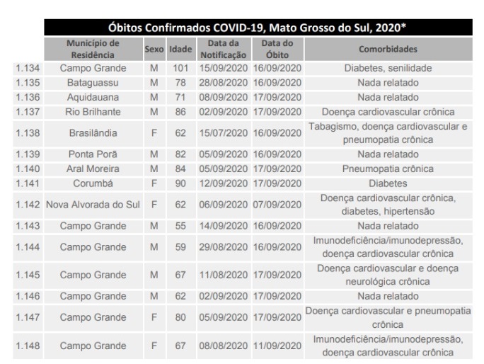 O número de óbitos já chega a 1.148 no Estado, com 15 novas mortes registradas hoje, das quais 7 são de Campo Grande, e outras em Aquidauana, Aral Moreira, Bataguassu, Brasilândia, Corumbá, Nova Alvorada do Sul, Ponta Porã e Rio Brilhante, sendo uma em cada cidade.
