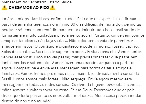 "Está circulando nas redes sociais uma mensagem com o título “Chegamos ao pico”, cujo texto é a mim atribuído. Quero esclarecer à população sul-mato-grossense que essa postagem não é de minha autoria. Mas reconheço que os alertas que ali estão sendo feitos, como se fossem meus, não são de todo ruins.