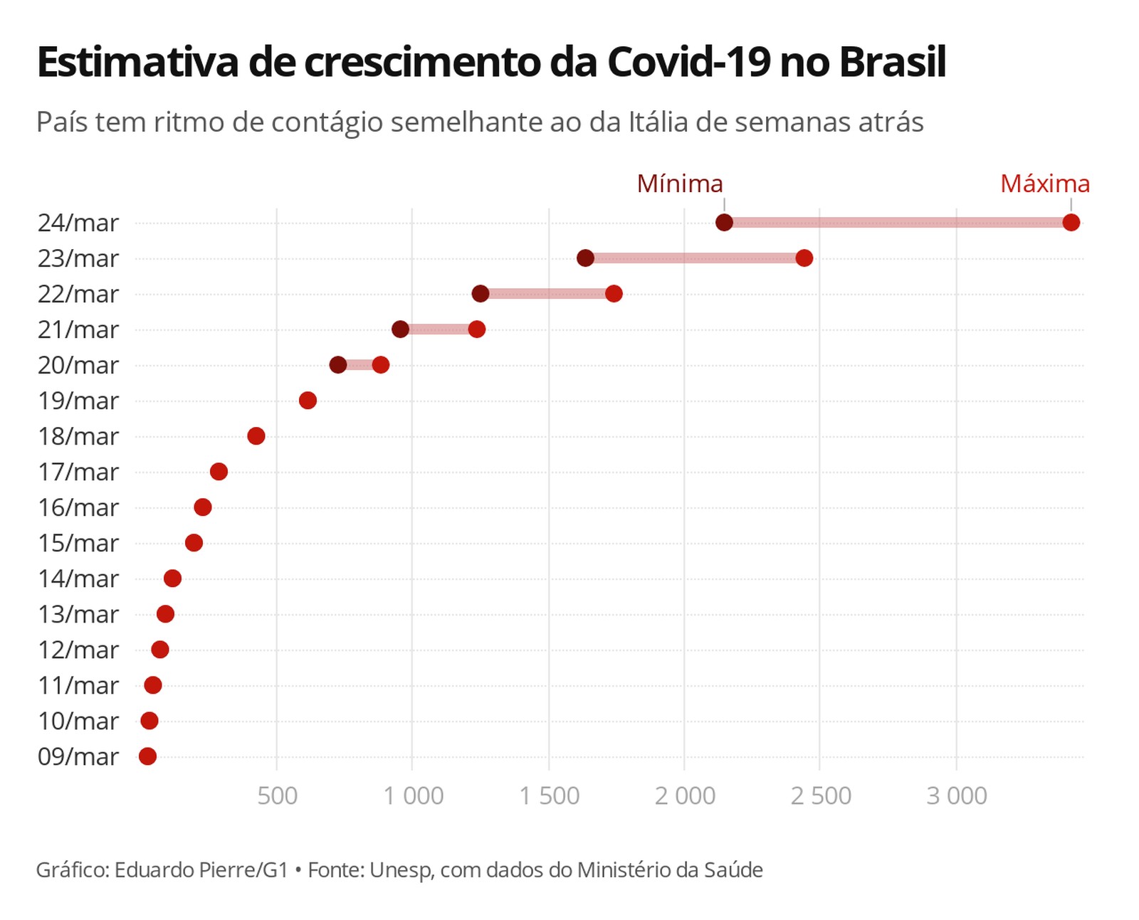 A disseminação do novo coronavírus (Covid-19) hoje no Brasil vem num ritmo igual ao da Itália de semanas atrás -- e ganhando velocidade. Segundo um estudo conduzido por sete universidades, o número de casos deve passar de 3 mil já na terça-feira (24).