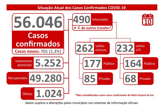 De acordo com a SES, dos 701 novos casos, 321 são de moradores de Campo Grande, Dourados 71 caso, Corumbá teve 61 casos. A Capital já contabiliza um total de 24.158 registros da doença. Dourados tem 6.228, Corumbá já registrou 3.113 casos e Sidrolândia com 1.893.