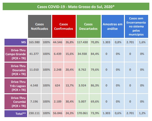 Conforme o boletim, MS já soma 230.111 casos notificados, dos quais 170.061 foram descartados. Há 1.303 amostras em análise no Laboratório Central de Mato Grosso do Sul (Lacen-MS) e 2.701 casos ainda aguardam encerramento pelos municípios.