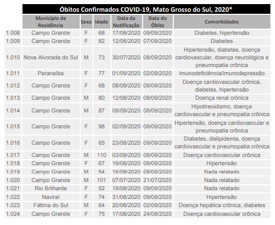 Nas últimas 24 horas, cinco homens e sete mulheres entre 54 e 110 anos morreram na capital. Em Nova Alvorada do Sul uma mulher 73 anos perdeu a vida, ela tinha doenças cardiovascular, doença neurológica e pneumopatia crônicacom, diabetes, hipertensão, em Paranaíba um óbito. Rio Brilhante confirmou a morte de uma mulher de 52 anos. Naviraí uma idosa de 74 anos morreu em decorrência da doença. Em Fátima do Sul um homem de 64 anos que tinha doença hepática crônica, diabetes.