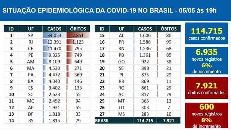 A informação é do Ministério da Saúde, segundo publicado nessa terça-feira (5), dia em que o Brasil teve o maior número de mortes, 600, e chegou a 114.715 casos confirmados.