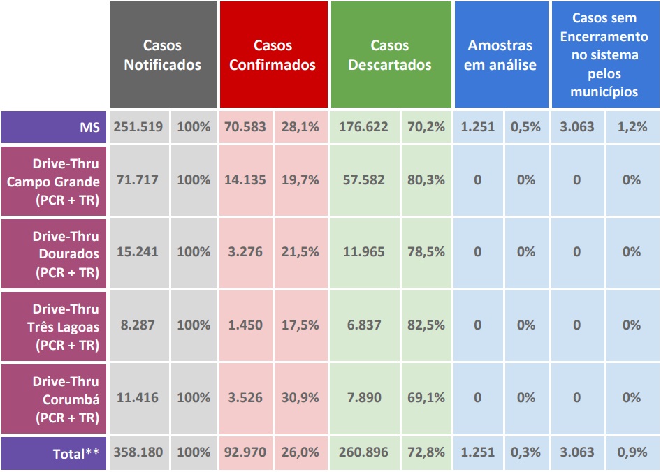 Conforme o boletim, MS já soma 358.180 casos notificados dos quais 260.896 foram descartados. Há 1.251 amostras em análise no Laboratório Central de Mato Grosso do Sul (Lacen-MS) e 3.063 casos ainda aguardam encerramento pelos municípios.