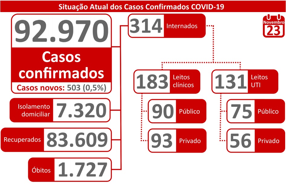 Mato Grosso do Sul confirmou mais 503 casos e cinco novas mortes em decorrência do coronavírus, que foram registrados nesta segunda. O número de infectados já chega a 92.970, a média móvel de casos registrados nos últimos sete dias, está em 694,1.