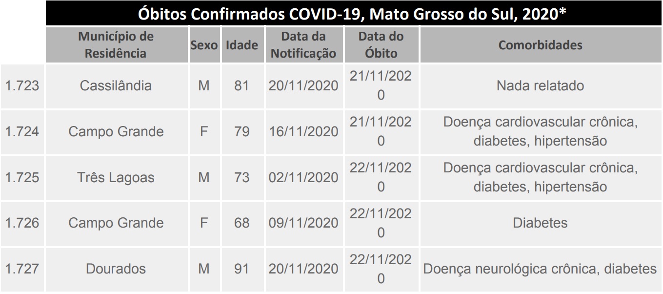 Conforme o boletim epidemiológico, foram registrados cinco óbitos, duas são de Campo Grande, e três municípios registraram uma morte, foram Cassilândia, Três Lagoas e Dourados. Somente uma das mortes não tem nada relatado, as outras tem algum tipo de comorbidades, como doenças cardiovasculares, diabetes, hipertensão, entre outras. Duas mortes ocorreram no dia 21 e outras três no dia 22 de novembro.