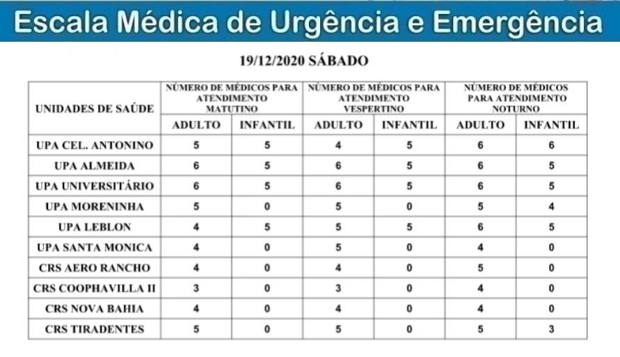 A Secretaria Municipal de Saúde Pública (Sesau) divulgou a escala de médicos para atendimento de urgência nas Unidades de Pronto Atendimento (UPASs) e Centros Regionais de Saúde (CRSs) de Campo Grande nesta sábado (19).