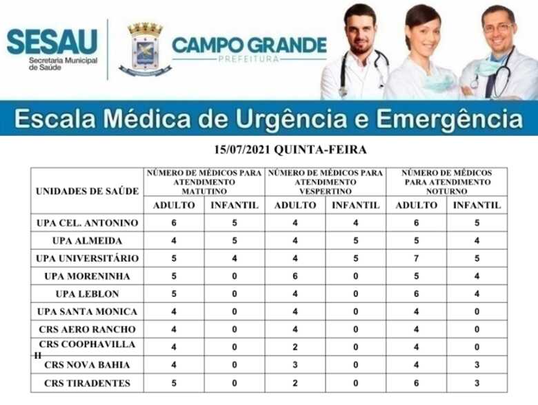 O atendimento infantil poderá ser encontrado pela manhã e de tarde na UPA Coronel Antonino, Vila Almeida e Universitário, sendo 14 profissionais distribuídos nas unidades no período matutino e 14 no período vespertino. Já a noite serão 28 pediatras em sete postos, exceto na UPA Santa Mônica, CRS Aero Rancho e Coophavilla.