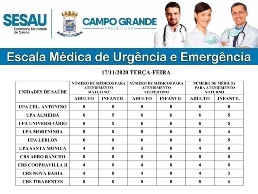 A Secretaria Municipal de Saúde Pública (Sesau) divulgou nesta terça-feira (17) a escala de médicos para atendimento de urgência nas Unidades de Pronto Atendimento (UPASs) e Centros Regionais de Saúde (CRSs) de Campo Grande.