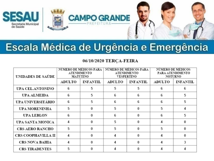 As Unidades de Pronto Atendimento (UPAs) de Campo Grande atendem nesta terça-feira (6), pela manhã, com 15 pediatras e 51 médicos clínicos gerais.
