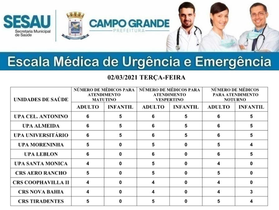 A Secretaria Municipal de Saúde Pública (Sesau), divulgou a escala de médicos para atendimento de urgência nas Unidades de Pronto Atendimento (UPASs) e Centros Regionais de Saúde (CRSs) de Campo Grande nesta terça-feira (2).