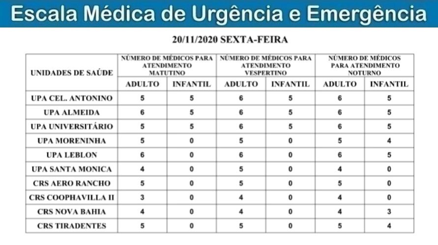 A Secretaria Municipal de Saúde Pública (Sesau) divulgou a escala de médicos para atendimento de urgência nas Unidades de Pronto Atendimento (UPASs) e Centros Regionais de Saúde (CRSs) de Campo Grande nesta sexta-feira (20).