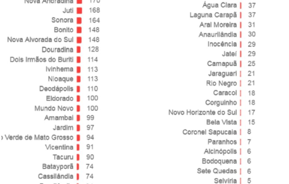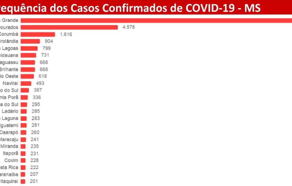 Dourados continua sendo a segunda cidade com mais casos com 4.575 mil seguida por Corumbá com 1.616 mil confirmações.