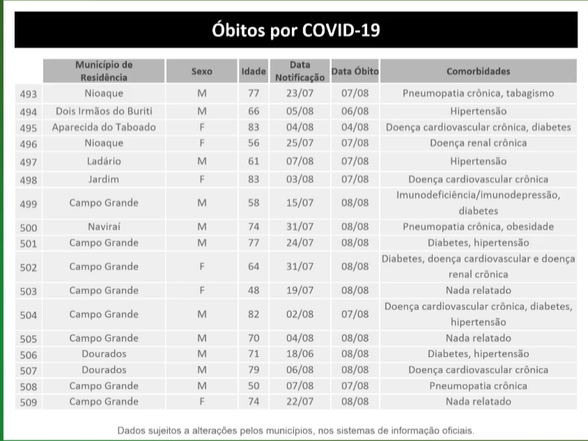 Ainda com relação aos novos registros, MS chega a 506 mortos pela doença, com a confirmação de 17 óbitos por coronavírus neste domingo. Oito deles são da capital, dos quais 3 eram idosos sem comorbidades. Confira a tabela.