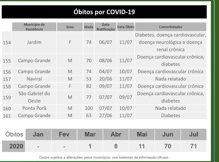 Campo Grande registrou 4 óbitos, sendo 3 homens e uma mulher, todos idosos com comorbidades. Outra morte foi de uma mulher de 100 anos em Ponta Porã sem comorbidades. São Gabriel do Oeste, Naviraí e Jardim também tiveram um óbito cada.