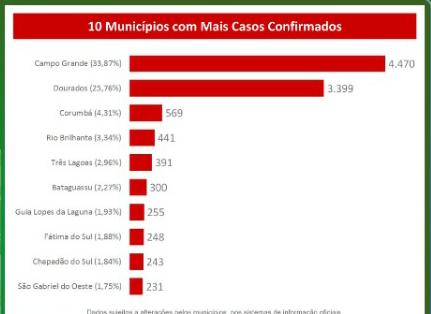 Do total de de 13.97 casos registrados no Mato Grosso do Sul, Campo Grande lidera a lista com 4.470 infectados, logo a frente de Dourados que já chegou a 3.399 casos e Corumbá com 569.
