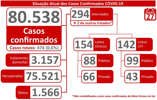 De acordo com a SES, dos 474 novos casos, as cinco cidades com mais casos em 24 horas, são Campo Grande com 181 casos, Dourados tem 79 casos, Três Lagoas com 49 notificações, Ladário 26 e Cassilândia com 13 casos.