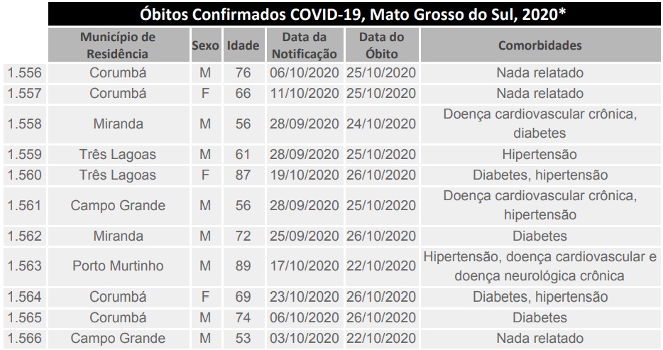 Foram registrados no boletim do coronavírus, 11 óbitos, quatro deles foram em Corumbá, em Campo Grande, Miranda e Três Lagoas foram duas mortes e uma em Porto Murtinho.