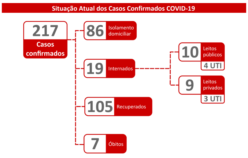 No boletim, que mostra novos 4 casos confirmados nas últimas 24 horas, também revela o número de pessoas curados. Hoje, MS já registra 217 pessoas com a doença, entre essas, 105 já estão curadas, como se pode ver na tabela abaixo.