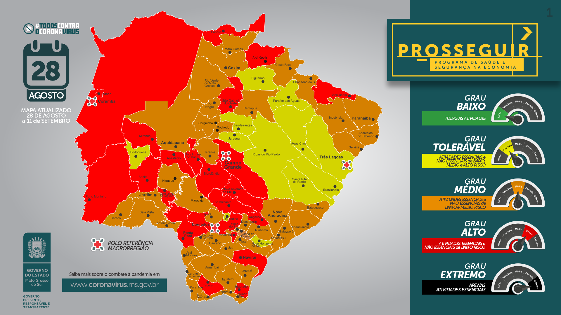 O mapa situacional das quatro macrorregiões de Saúde (Corumbá, Campo Grande, Três Lagoas e Dourados), referente à 34ª Semana Epidemiológica (de 16 a 22 de agosto), apresenta 12 municípios na faixa de risco tolerável (amarela), 45 municípios no grau médio (bandeira laranja) e 22 no grau de risco alto (bandeira vermelha).