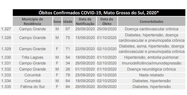 Também foram registradas 9 mortes em todo o estado, que já totaliza 1.335 mil óbitos causados pela doença. Em Campo Grande, 5 pessoas morreram nas últimas 24h, 2 foram em Corumbá, e Três Lagoas e Fátima do Sul tiveram um óbito sendo a maioria das vítimas com comorbidades relatadas. Veja o perfil das vítimas.