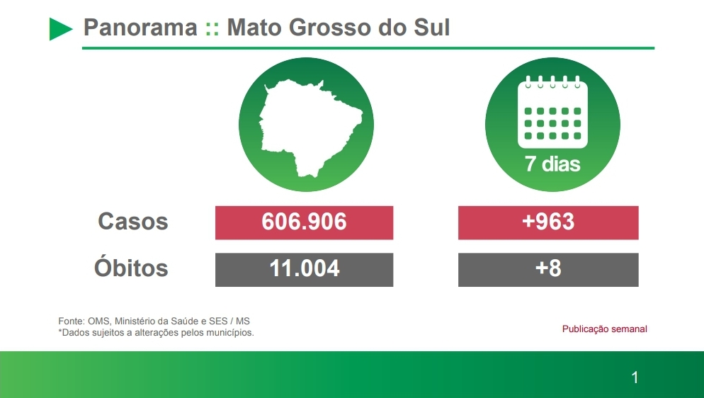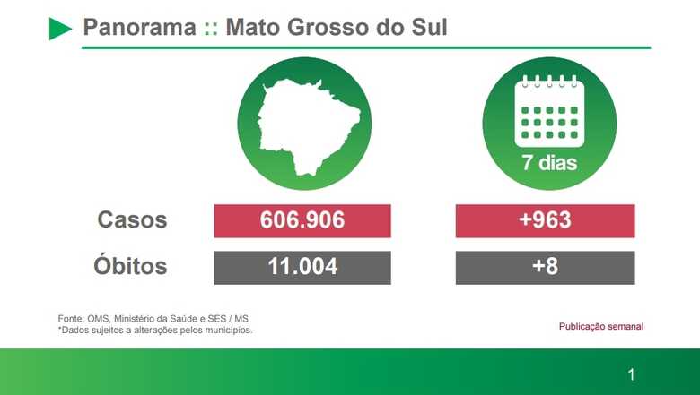 Foram notificadas no estado, oito mortes e 963 novos casos de Covid-19 na última semana. Também foi divulgado que oito pessoas estão internadas devido a doença e 1.310 pessoas estão em isolamento domiciliar.