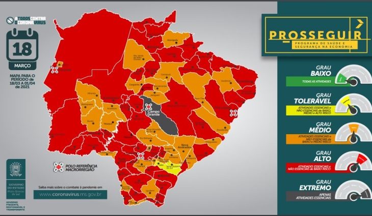 A atualização do “Prosseguir” desta quinta-feira (18), mostra uma piora nos casos de covid-19 em Mato Grosso do Sul em relação a última atualização feita no final de fevereiro. Agora, 44 municípios estão na bandeira vermelha e a Capital entrou na bandeira cinza, quando a avaliação é de risco extremo de contaminação.