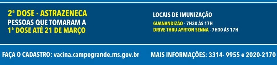 Também tomam a vacina hoje, pessoas que tomaram a primeira dose de Astrazeneca até o dia 21 de março. Sendo o drive-thru Guanandizão e Ayrton Senna os locais onde serão aplicadas a 2ª dose, das 7h30 às 17h.