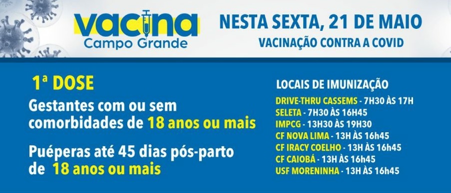 O calendário de imunização contra Covid-19, abre a vacinação para gestantes e puérperas (até 45 dias pós-parto) com 18 anos ou mais nesta sexta-feira (19), em um dos sete locais disponíveis.