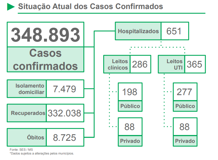 Boletim epidemiológico desta terça-feira (20) mostra que foram confirmados mais 261 casos e 32 óbitos em decorrência da covid-19 nas últimas 24 horas em Mato Grosso do Sul.