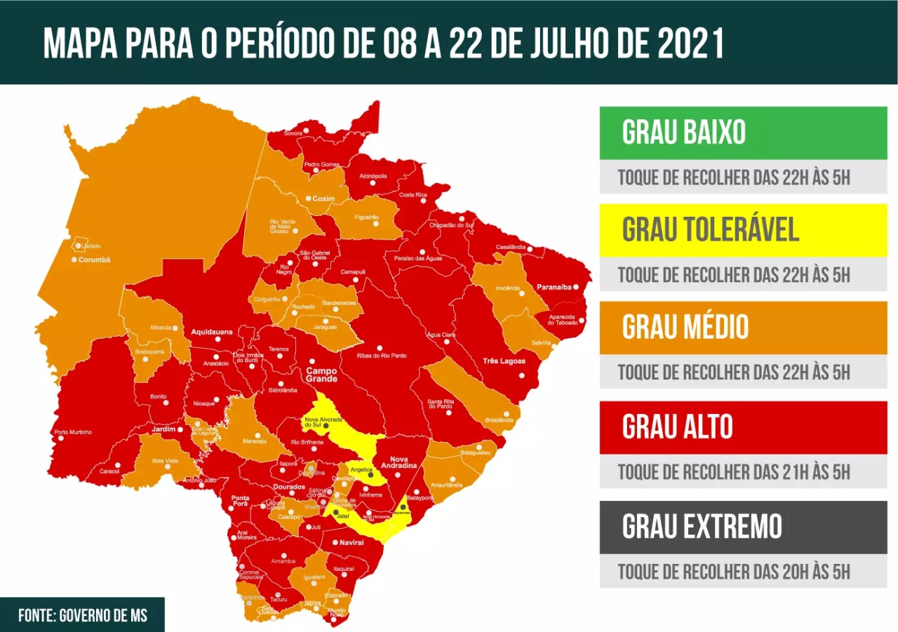 Já a lista de municípios com bandeira vermelha tem, além da Capital, Água Clara, Alcinópolis, Amambai, Anastácio, Antônio João, Aparecida do Taboado, Aquidauana, Aral Moreira, Batayporã, Bonito, Camapuã, Caracol, Cassilândia, Chapadão do Sul, Coronel Sapucaia, Dois Irmãos do Buriti, Dourados, Eldorado e Fátima do Sul.