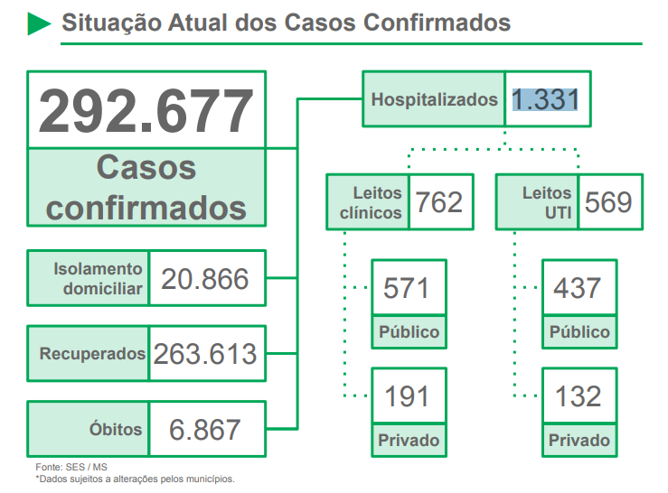 Boletim epidemiológico desta terça-feira (1º) mostra que mais 1.952 pessoas foram infectadas pela covid-19 e 52 foram a óbitos decorrentes da doença. MS já registra 292.677 casos confirmados e 6.867 por causa do coronavírus.