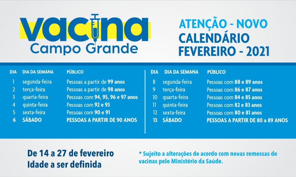 Para o público acima de 80 anos foram enviadas somente 3,6 mil doses. Campo Grande tem 18 mil idosos com mais de 80 anos, dos quais 2 mil estão em asilos e já estão todos imunizados. 1,1 mil acamados estão sendo vacinados em casa e o restante, recebendo a vacina conforme o cronograma e a disponibilidade de doses.