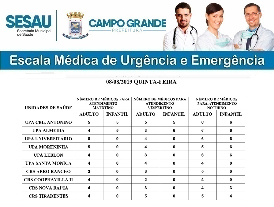 Dez médicos pediatras e 43 clínicos gerais atenderão nesta manhã de segunda-feira (5) em Campo Grande. Dos pediatras, cinco profissionais atenderão na Unidade de Pronto Atendimento (UPA) Vila Almeida e cinco atendem na UPA Coronel Antonino.