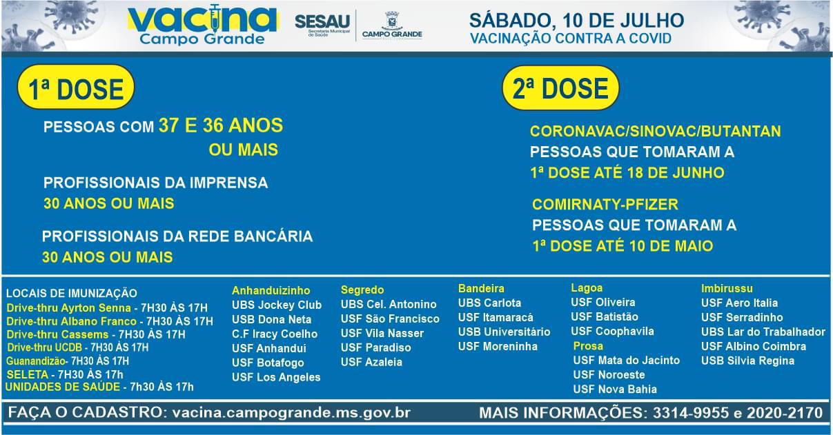 Neste sábado (10), a Prefeitura de Campo Grande vacina pessoas com com 36 anos ou mais e profissionais da imprensa e rede bancária. A segunda dose da Coronavac e Pfizer também estão sendo aplicadas. Quem precisar tomar o imunizante da AstraZeneca, deve aguardar uma nova remessa de vacina. De acordo com a Secretaria Municipal de Saúde (Sesau), é preciso aguardar o recebimento para reabertura do calendário de segunda dose da AstraZeneca.