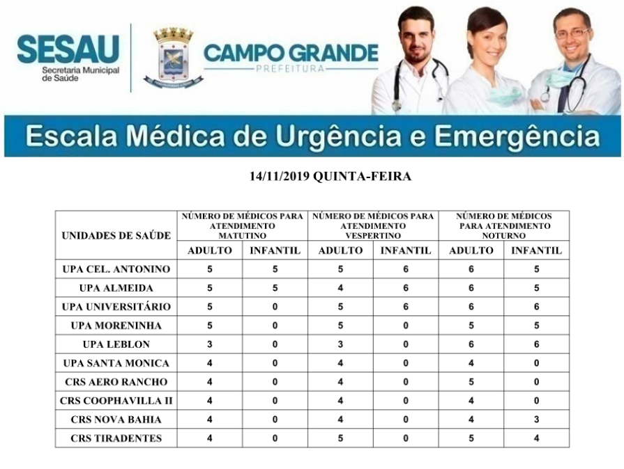 No período da tarde, além das duas unidades anteriores, o UPA Universitária também passa a contar com o profissional de atendimento infantil. Já no período noturno, apenas as unidades do Santa Monica, Coophavilla II e Aero rancho permanecem sem os pediatras.
