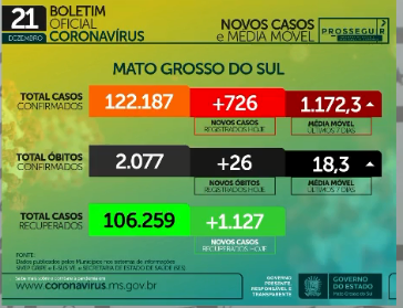 De acordo com o boletim epidemiológico da Secretaria de Estado de Saúde (SES) desta segunda-feira (21) o Estado atingiu 122.187 pessoas infectadas pelo coronavírus. Em 24 horas, 726 novos casos foram registrados em MS e 26 mortes foram confirmadas.