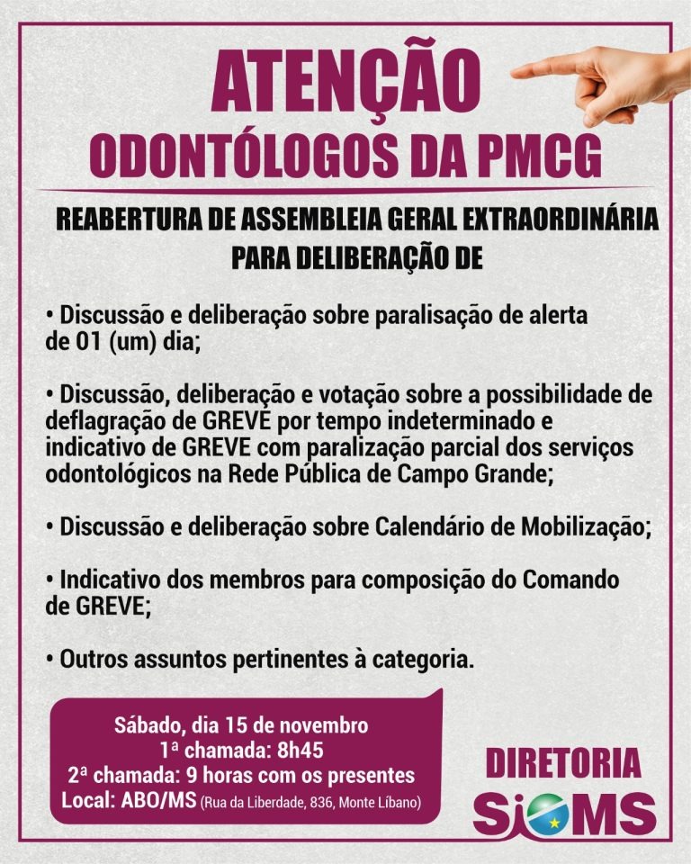 Os odontologistas da rede pública de Campo Grande podem entrar em greve nos próximos dias. O Sindicato dos Odontologistas de Mato Grosso do Sul (SIOMS) convocou uma Assembleia Geral Extraordinária para este sábado (15), na ABO/MS para decidir os rumos do movimento, após a Prefeitura não cumprir uma decisão judicial que determina o reposicionamento dos profissionais no Plano de Cargos e Carreiras.