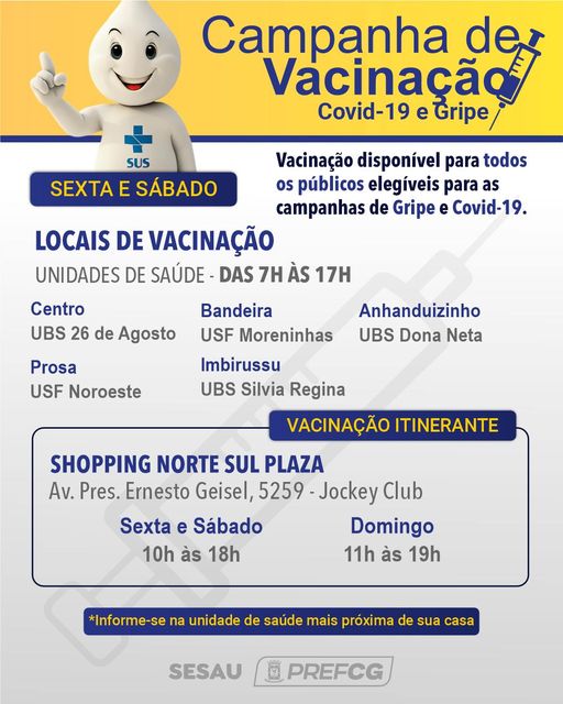 Também está disponível, o imunológico contra gripe. A campanha nacional contra a gripe iniciou nesta semana em Campo Grande e a meta é vacinar cerca de 200 mil pessoas que fazem parte dos 18 grupos elencados pelo Ministério da Saúde como prioritários.