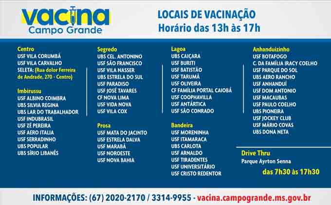 A vacinação do público idoso será realizada em unidades de segunda a sexta-feira, de 13h às 17h, no sábado de 7h30 às 17h30, já no drive-thru do Aero Rancho, o funcionamento será de segunda a sábado das 7h30 às 17h30.